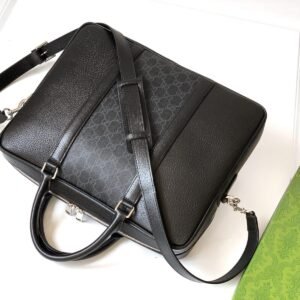 The GUCCI Black Medium Briefcase in Black GG Supreme is the epitome of luxury and functionality. Crafted from high-quality GG Supreme canvas, this briefcase features a sleek black finish with the iconic GUCCI monogram, exuding timeless sophistication. The spacious interior offers ample room for documents, laptops, and essentials, while the top handle and detachable shoulder strap provide versatile carrying options. Finished with premium leather trim, gold-tone hardware, and a secure top zip closure, this briefcase is perfect for professionals who demand style and durability. A true statement piece for the modern executive.