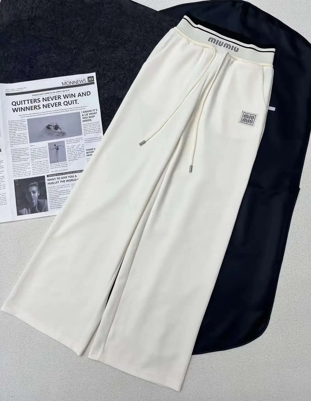The straight-leg silhouette provides a modern, clean line from hip to ankle, creating a universally flattering profile. Featuring a comfortable mid-rise waist and an adjustable drawstring tie, they deliver a perfect balance of polished style and effortless comfort. The subtle MIU MIU branding is a whisper of luxury, making these joggers a versatile cornerstone for both refined and casual ensembles. Pair them with a crisp button-down and blazer for an intelligent off-duty look, or with a simple tee and designer sneakers for understated, chic comfort.